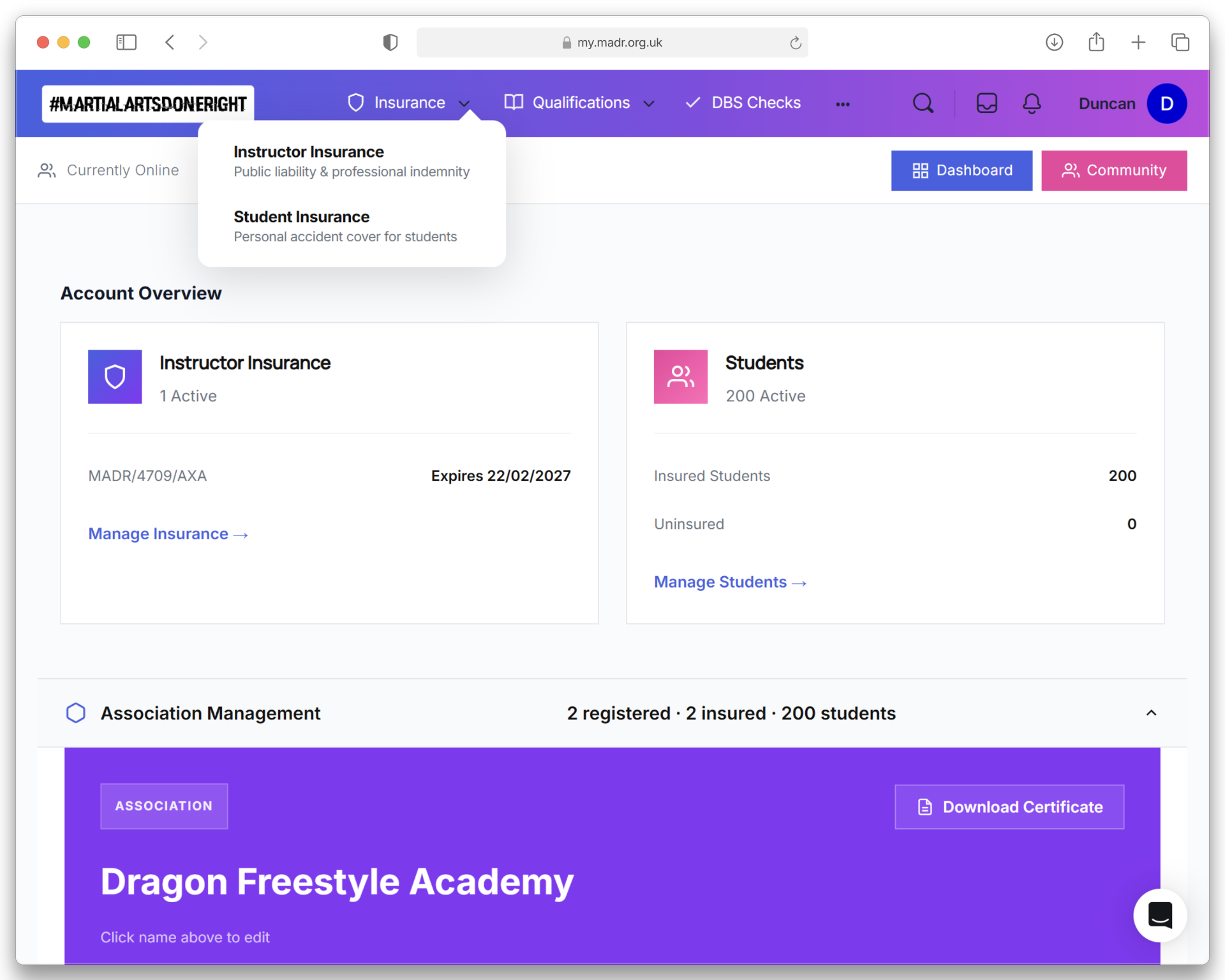Insurance, students, DBS checks, qualifications and documents. All tracked in your secure MADR portal. No juggling multiple providers or logins.